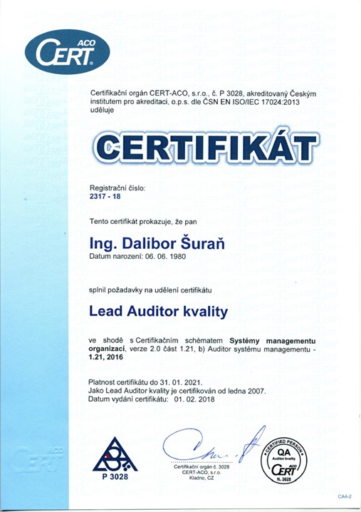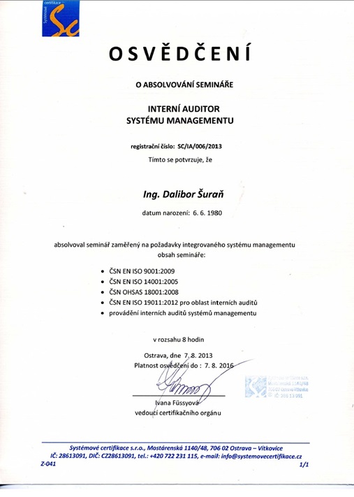 - Odborné vedení týmu včetně vydání osvědčení pro interní auditory.